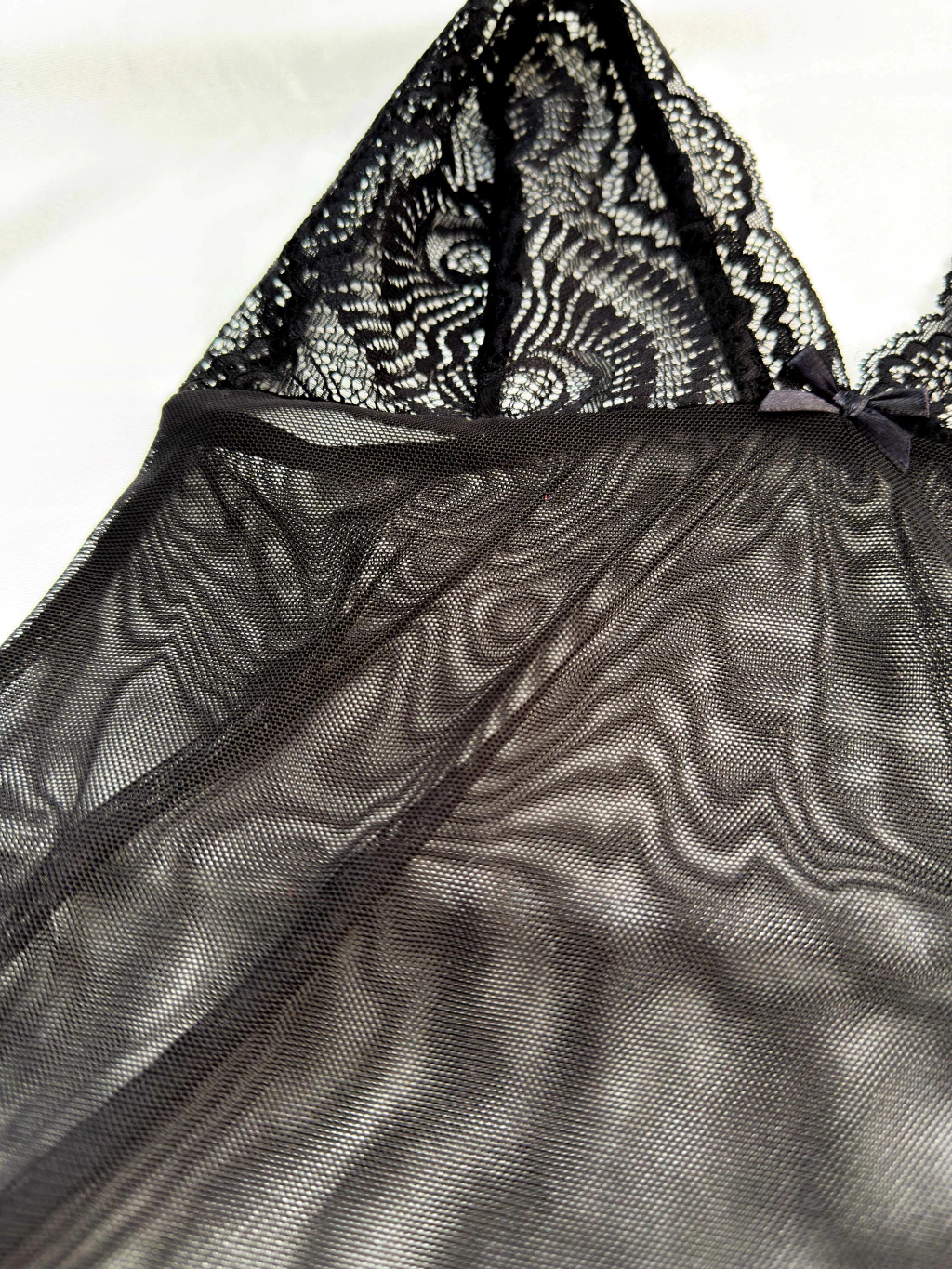 Conjunto Baby Doll con bombacha. Confeccionado en mircotul, encaje y detalles en puntilla.